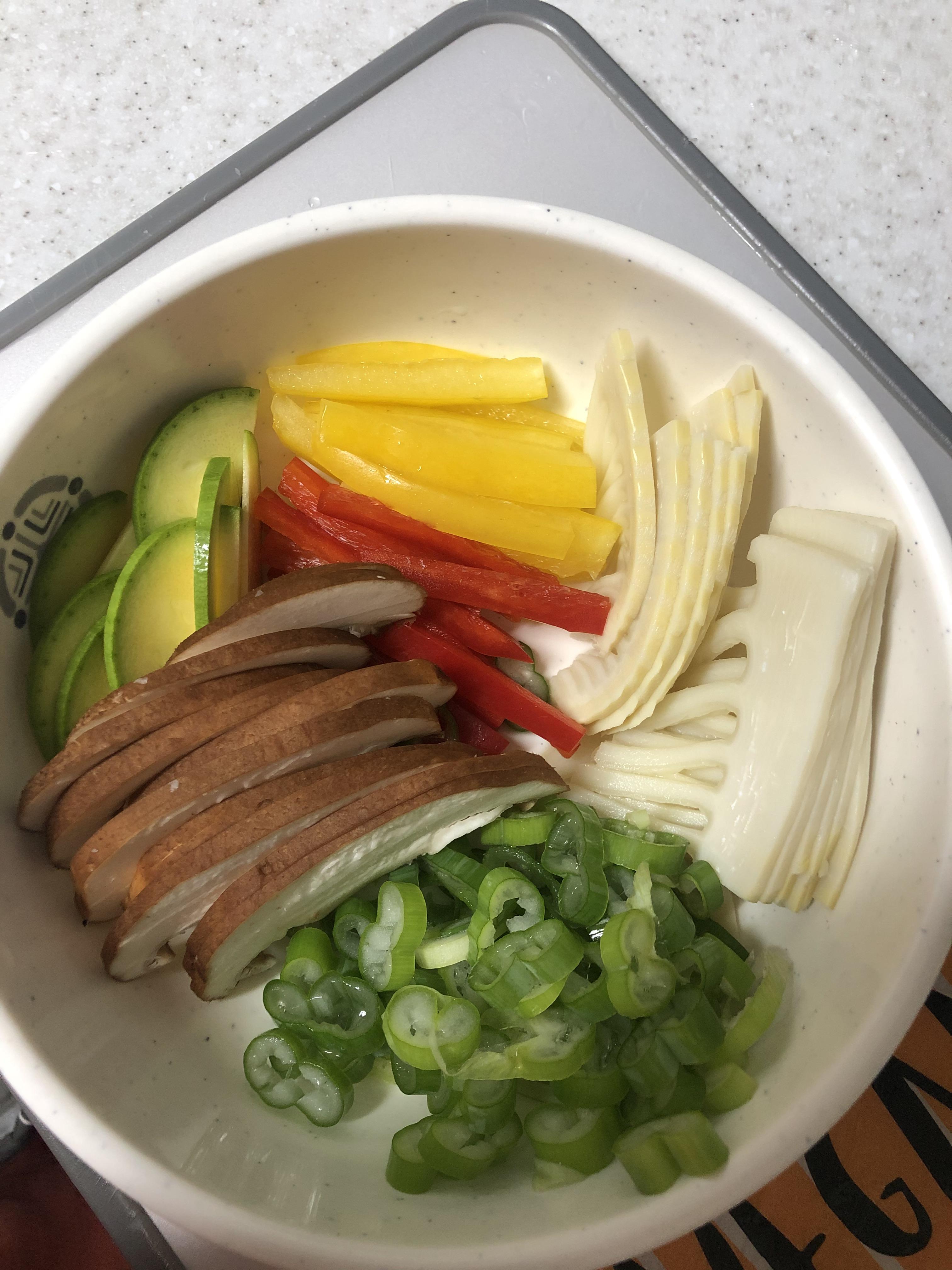 버섯, 죽순, 대파, 파프리카, 애호박, 마법의 황색가루