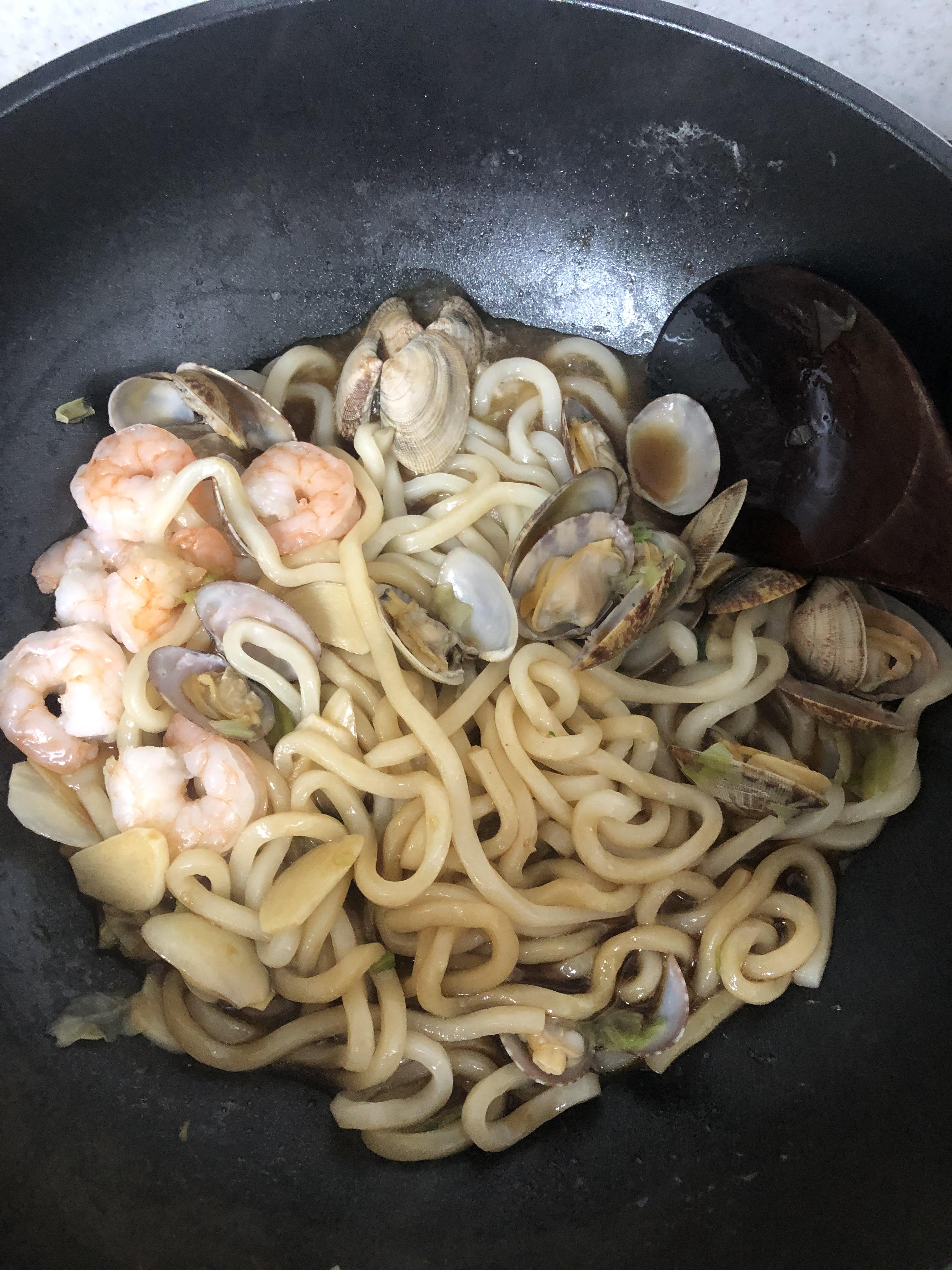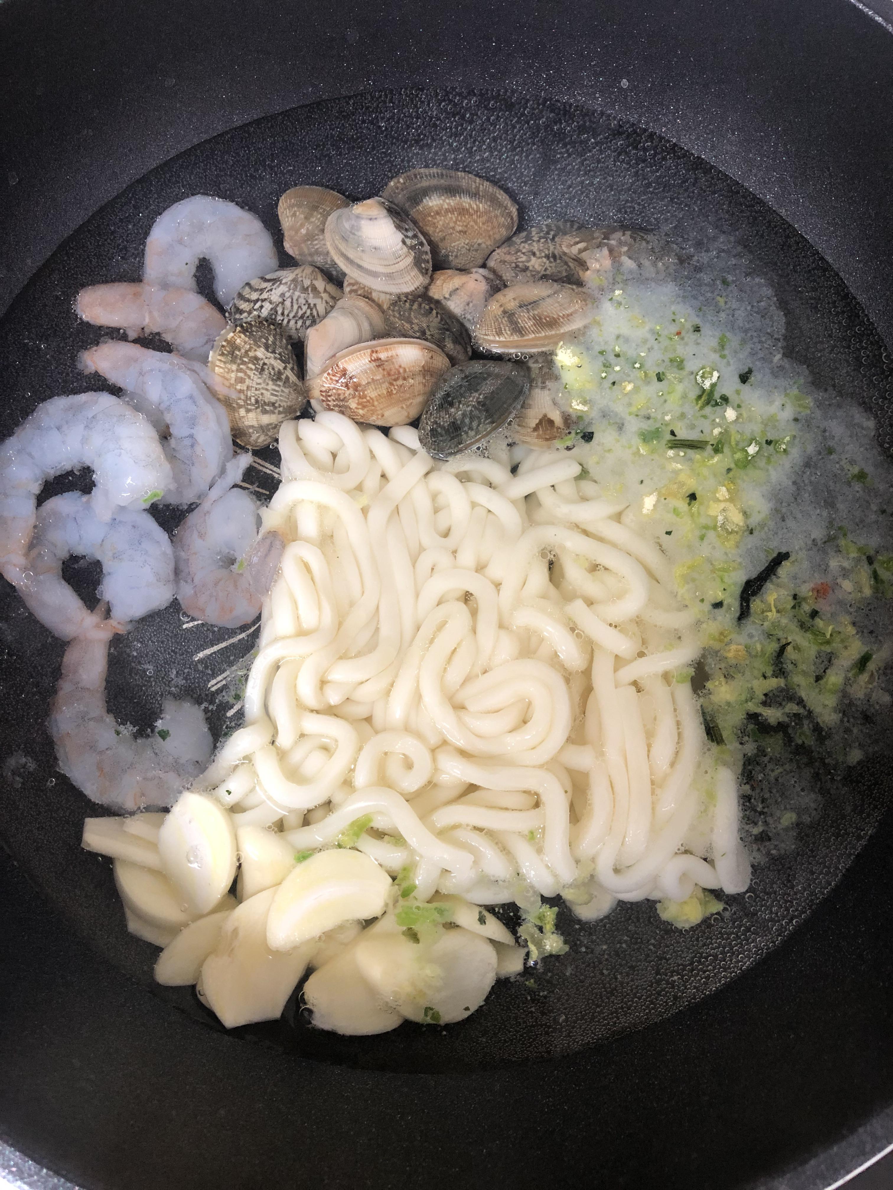 끓는물에 생생우동면과 후레이크, 새우, 바지락,